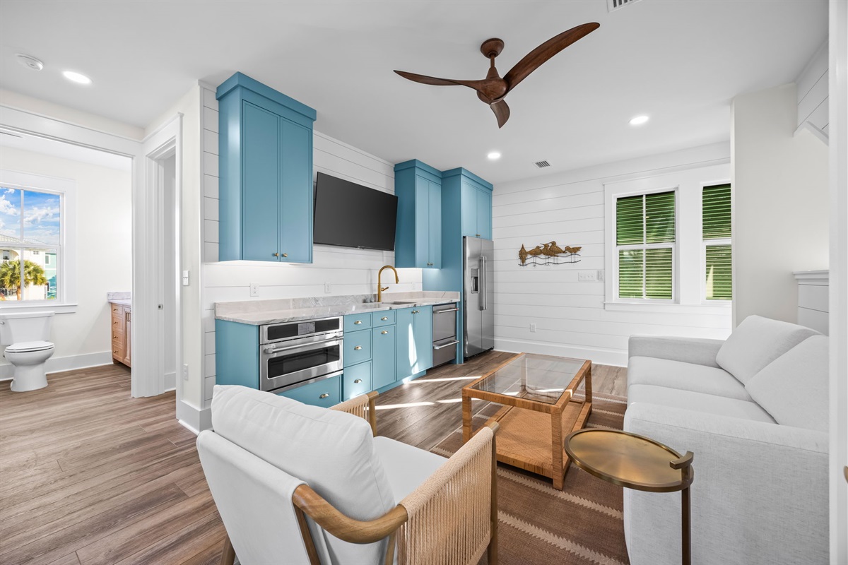 The kitchenette is thoughtfully outfitted with Café brand appliances — a full-size refrigerator, dual convection microwave oven, and 2-drawer dishwasher. A portable 2-burner induction cooktop with a compact countertop vent is provided for easy meal prep. A stylish Kohler pull-down faucet, cookware, and essentials are included.